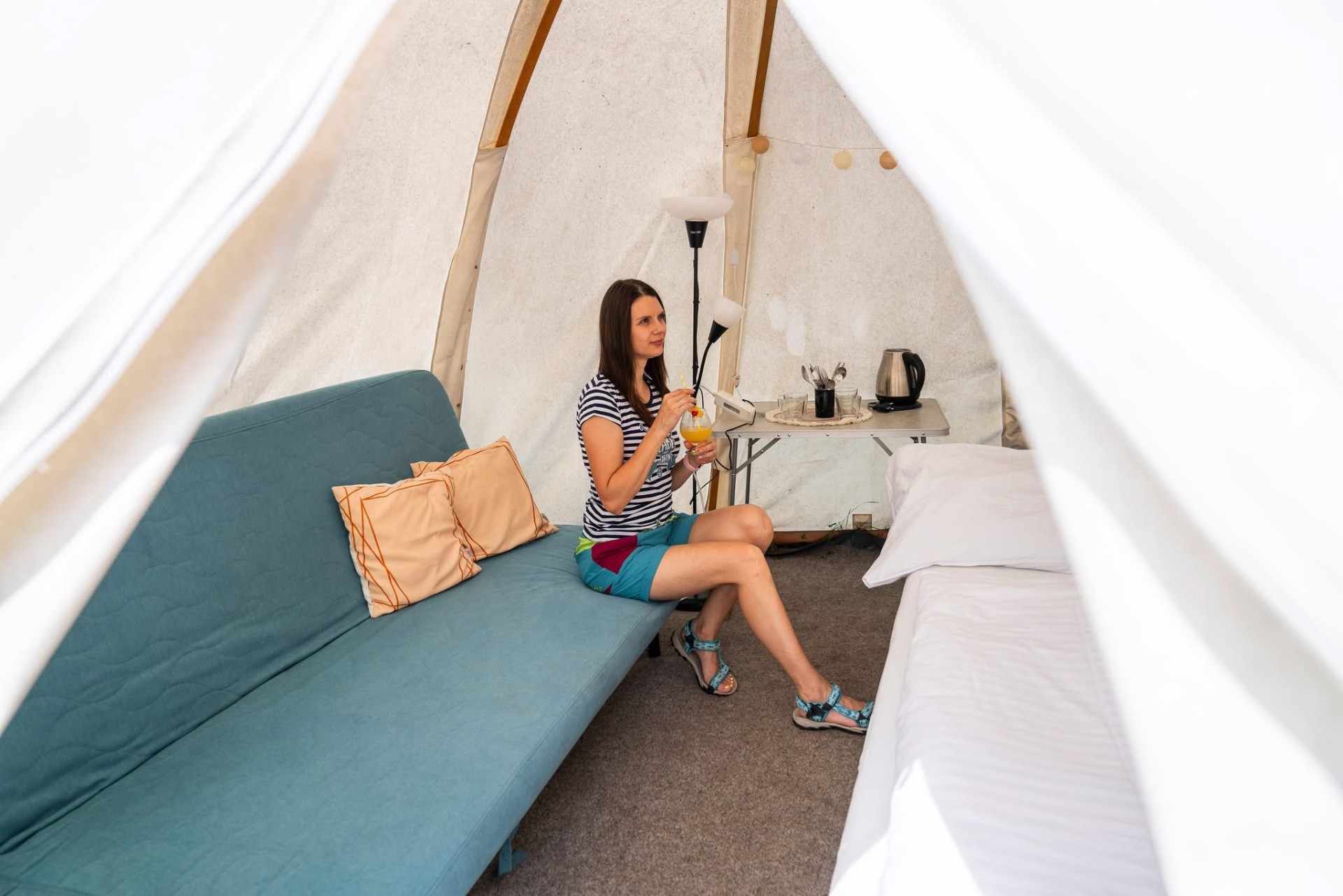 - Ubytovat je možné se v bungalovech, plně vybavených obytných stanech, glampingových stanech nebo ve vlastních stanech či karavanech, pro které jsou připraveny elektrické přípojky a další zázemí.