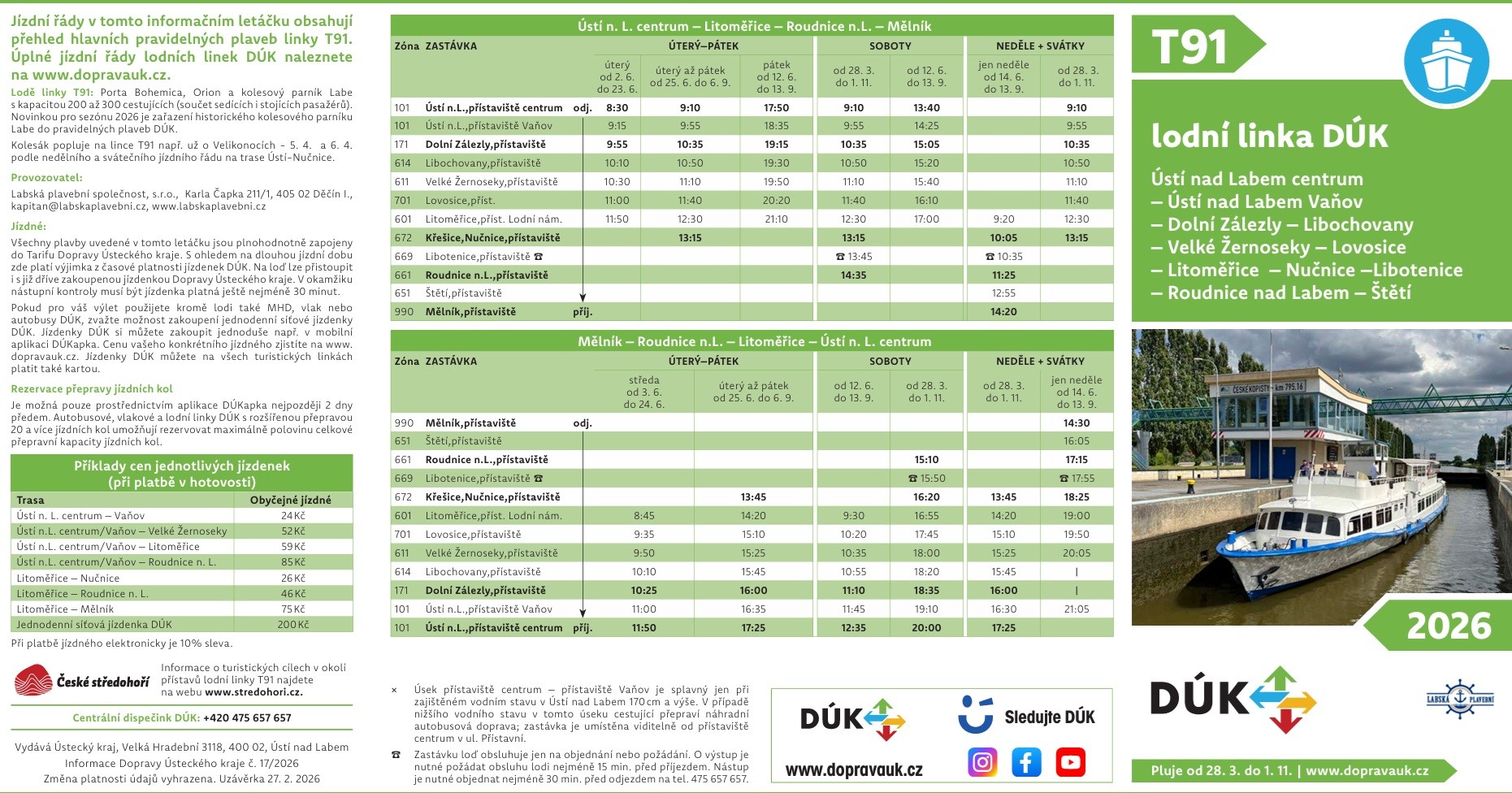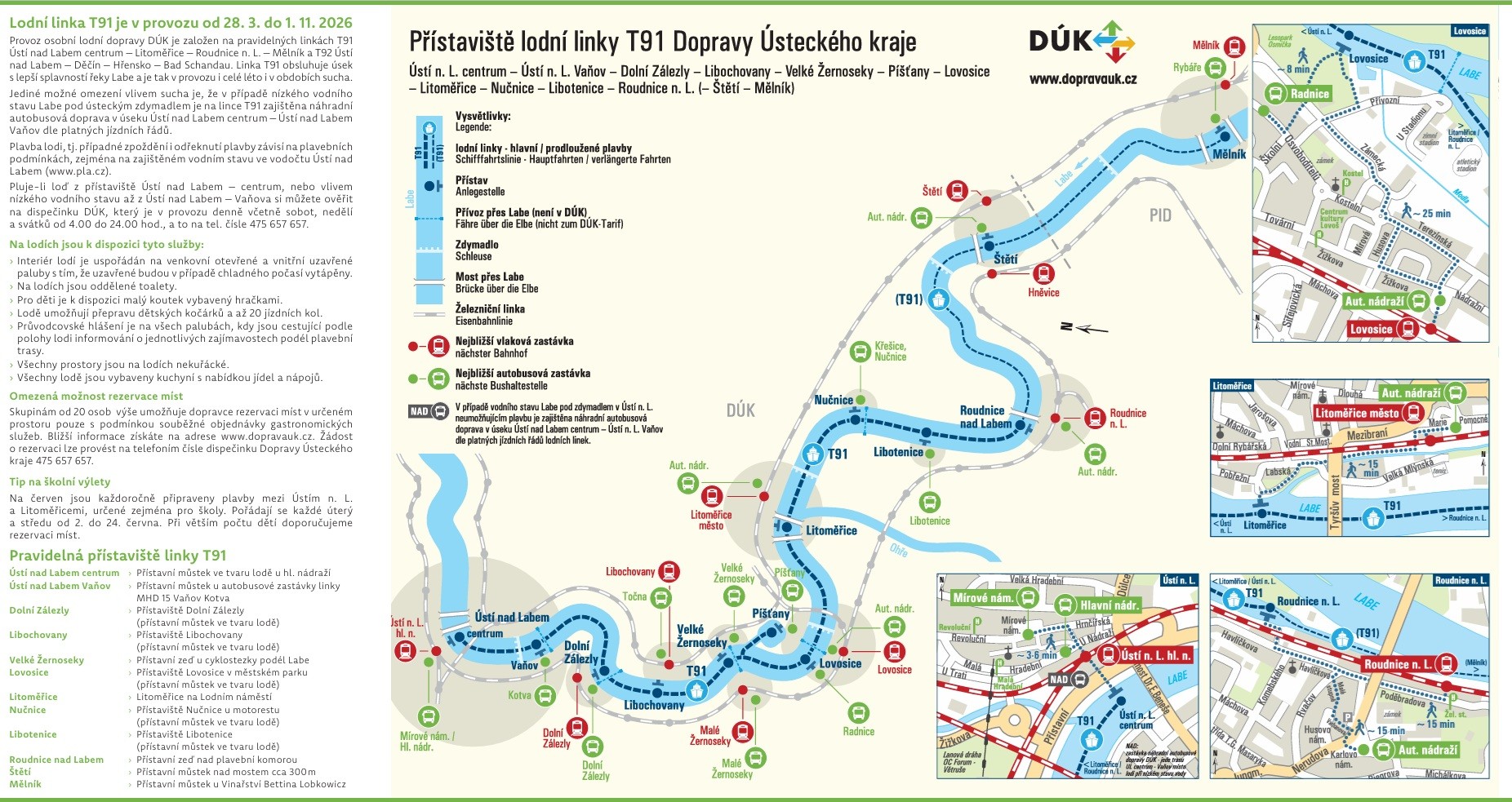 Wenn Sie neben dem Schiff auch den Zug oder die grünen Busse für Ihre Reise nutzen, sollten Sie den Kauf einer integrierten Tagesnetzkarte in Erwägung ziehen. Erkundigen Sie sich am DUC-Tarifschalter unter www.dopravauk.cz nach dem Preis für Ihren speziellen Tarif.