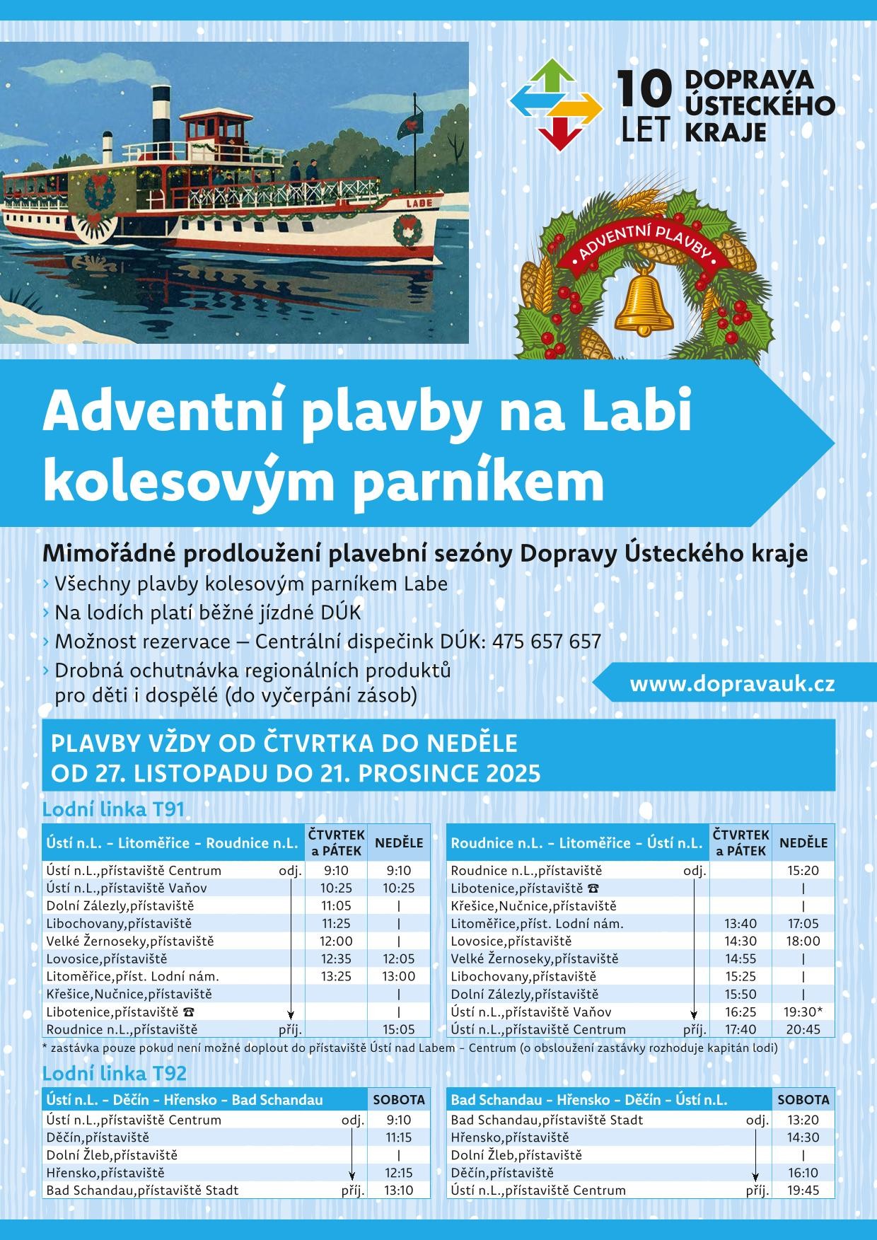 Vyploují obě lodní linky T91 na trase Ústí nad Labem - Litoměřice - Roudnice nad Labem a T92 z Ústí nad Labem - Děčín - Hřensko až do Bad Schandau, a to za běžné jízdné Dopravy Ústeckého kraje. Součástí plavby je i ochutnávka regionálních produktů (do vyčerpání zásob).