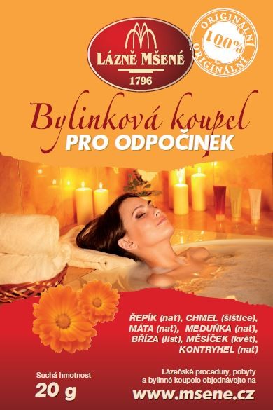 Bylinková koupel Pro odpočinek Je relaxační koupel, která působí příznivě na odstranění stresu, duševního napětí a uvolňuje svalstvo celého těla.