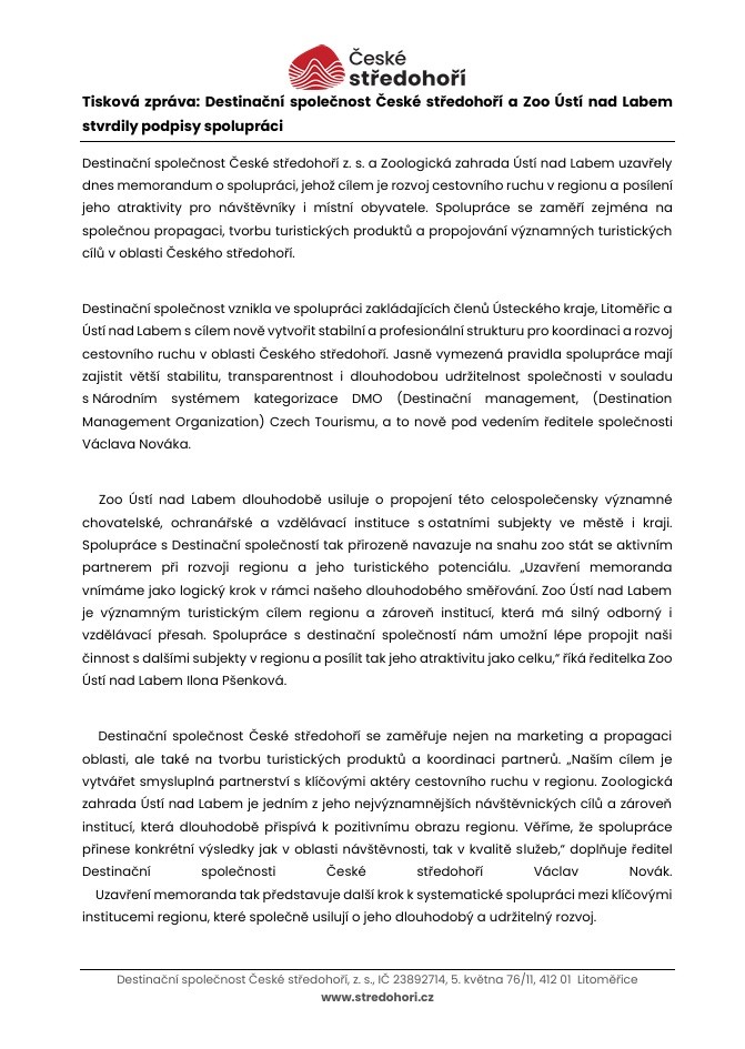 Destinační společnost České středohoří se zaměřuje nejen na marketing a propagaci oblasti, ale také na tvorbu turistických produktů a koordinaci partnerů. „Naším cílem je vytvářet smysluplná partnerství s klíčovými aktéry cestovního ruchu v regionu. Zoologická zahrada Ústí nad Labem je jedním z jeho nejvýznamnějších návštěvnických cílů a zároveň institucí, která dlouhodobě přispívá k pozitivnímu obrazu regionu. Věříme, že spolupráce přinese konkrétní výsledky jak v oblasti návštěvnosti, tak v kvalitě služeb,“ doplňuje ředitel Destinační společnosti České středohoří Václav Novák.