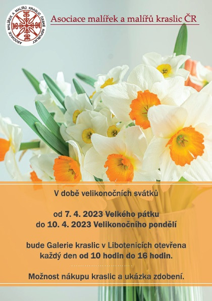 Asociace malířek a malířů kraslic ČR zve do Galerie kraslic v Libotenicích na jedinou celoroční expozicí s více než 1 200 kraslicemi vyráběnými tradičními technikami. Můžete se těšit na ukázku zdobení a možnost nákupu kraslic.