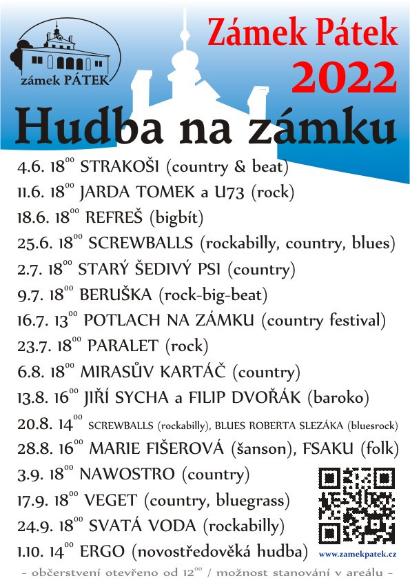Pro letošní léto je na páteckém zámku připravena živá hudba na (téměř) každou sobotu, většinou od 18 do 22 hodin. V areálu zámku je možné i přespat pod širákem či ve stanu.