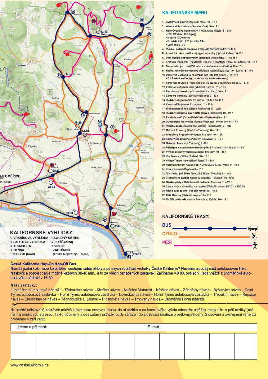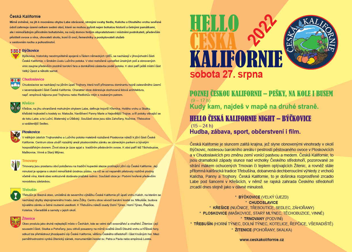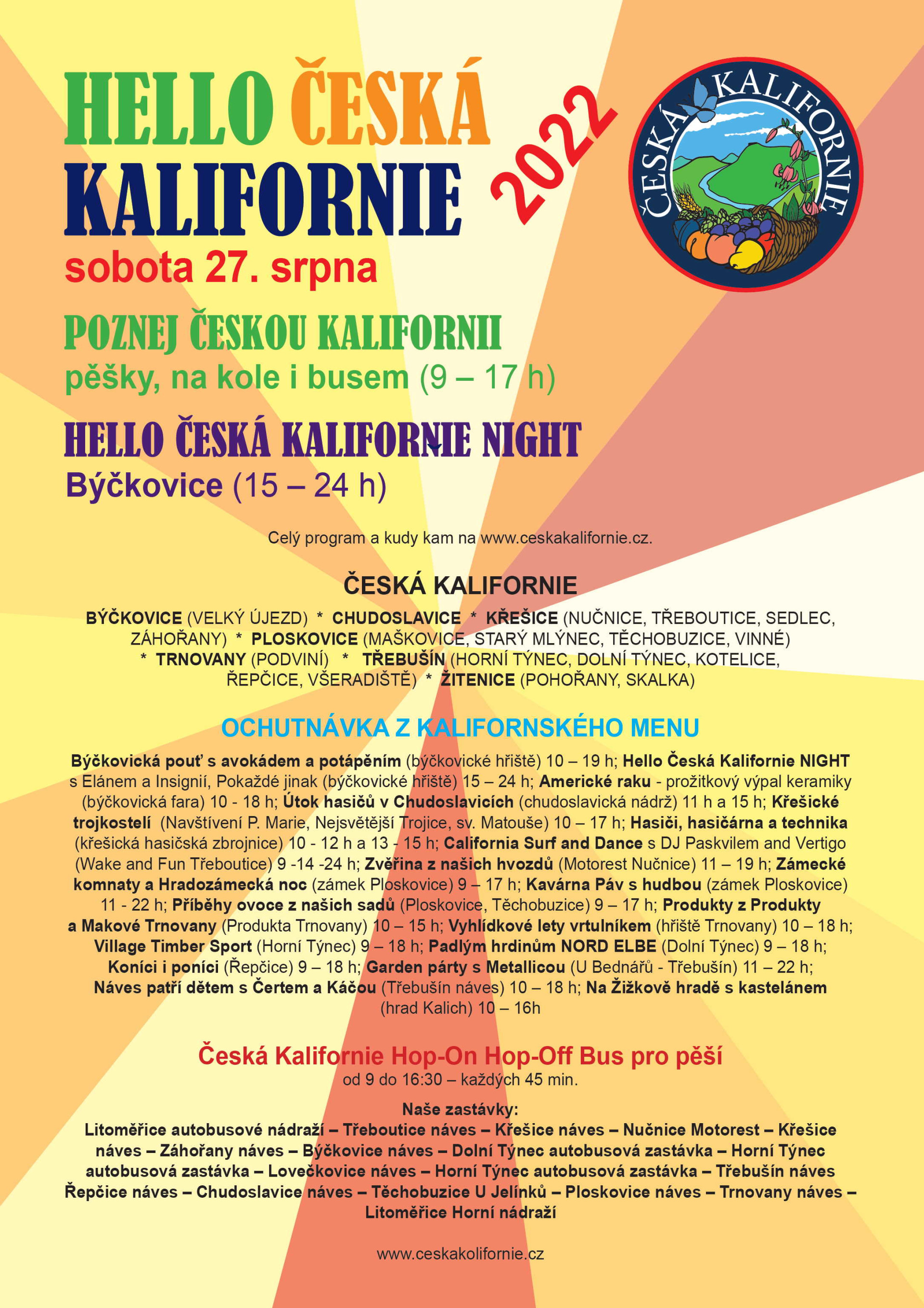 Další akcí v sobotu 27. srpna je novinka nazvaná Hello, Česká Kalifornie. Ta se uskuteční od 9 do 23 hodin a to na několika místech. Česká Kalifornie zahrnuje Býčkovice, Velký Újezd, Chudoslavice, Křešice, Nučnice, Třeboutice, Sedlec, Záhořany, Ploskovice, Maškovice, Starý Mlýnec, Těchobuzice, Vinné, Trnovany, Podviní, Třebušín, Horní Týnec, Dolní Týnec, Kotelice, Řepčice, Všeradiště, Žitenice, Pohořany, Skalka.
