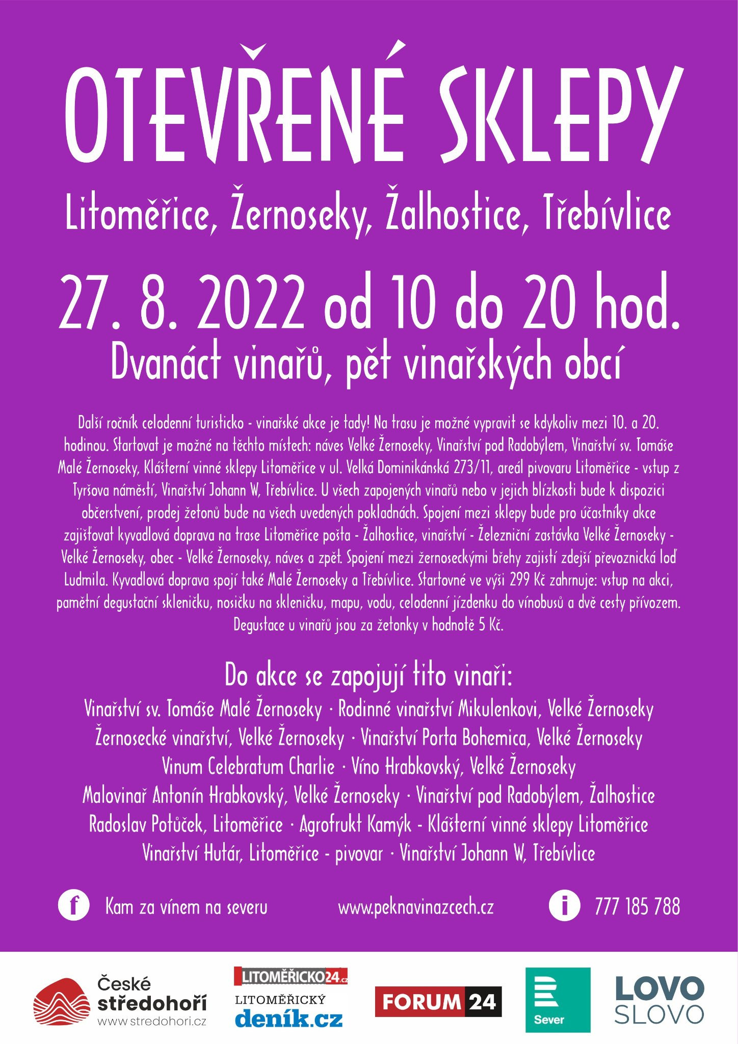 V sobotu 27. srpna mohou návštěvníci v Českém středohoří vyrazit na oblíbenou akci Otevřené sklepy Českého středohoří. Ta se koná od 10 do 20 hodin hned v pěti vinařských obcích (Litoměřice, Velké Žernoseky, Malé Žernoseky, Žalhostice a Třebívlice). Za vstupné v hodnotě 299 Kč získáte degustační pamětní skleničku, nosičku na skleničku, mapu, vodu, palubní lístek na dvě cesty přívozem a celodenní jízdenku na dopravu mezi vinařstvími. Degustace u vinařů jsou za žetonky v hodnotě 5 Kč. Bližší informace k akci najdete zde. Info najdete i v události na Facebooku.