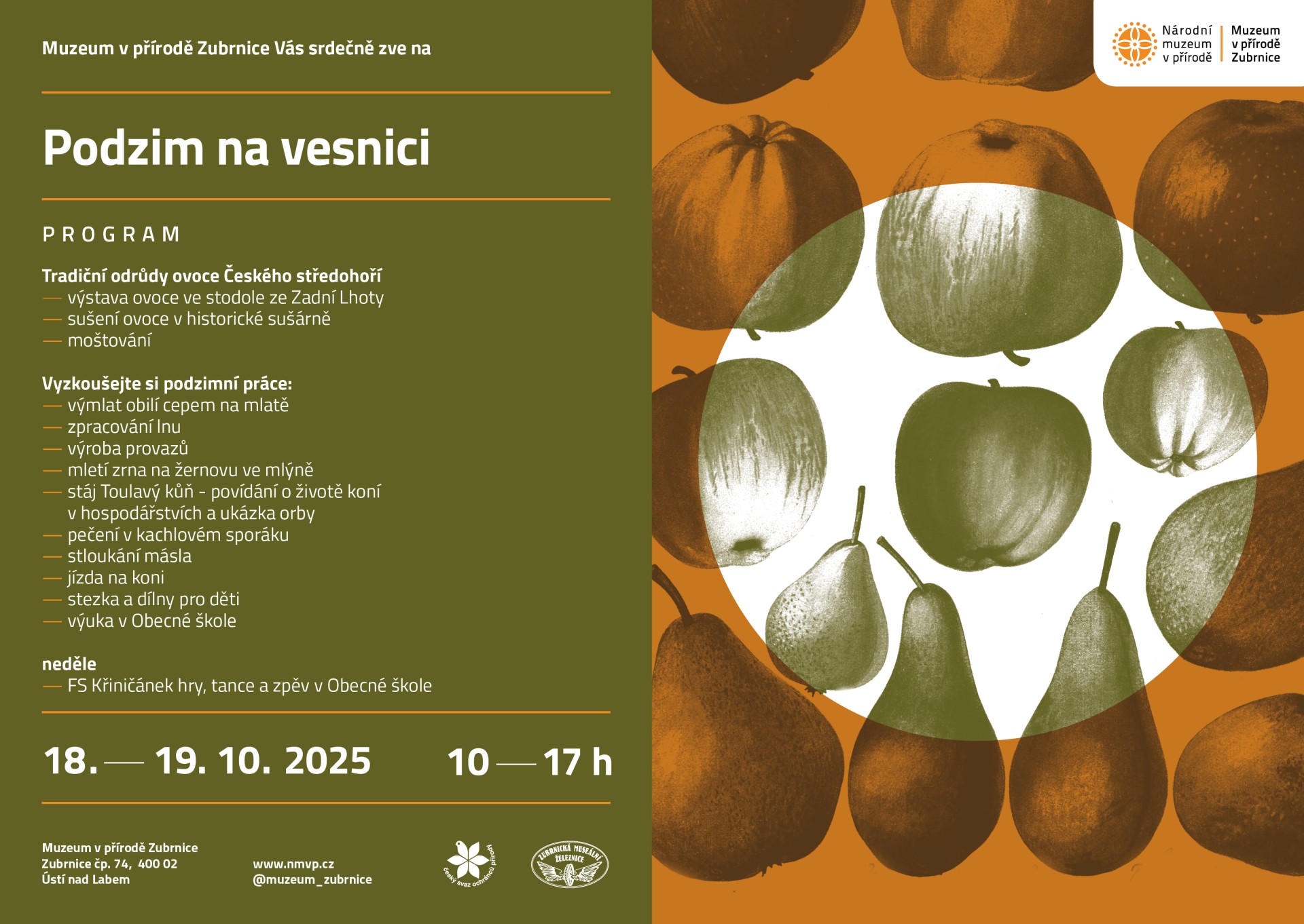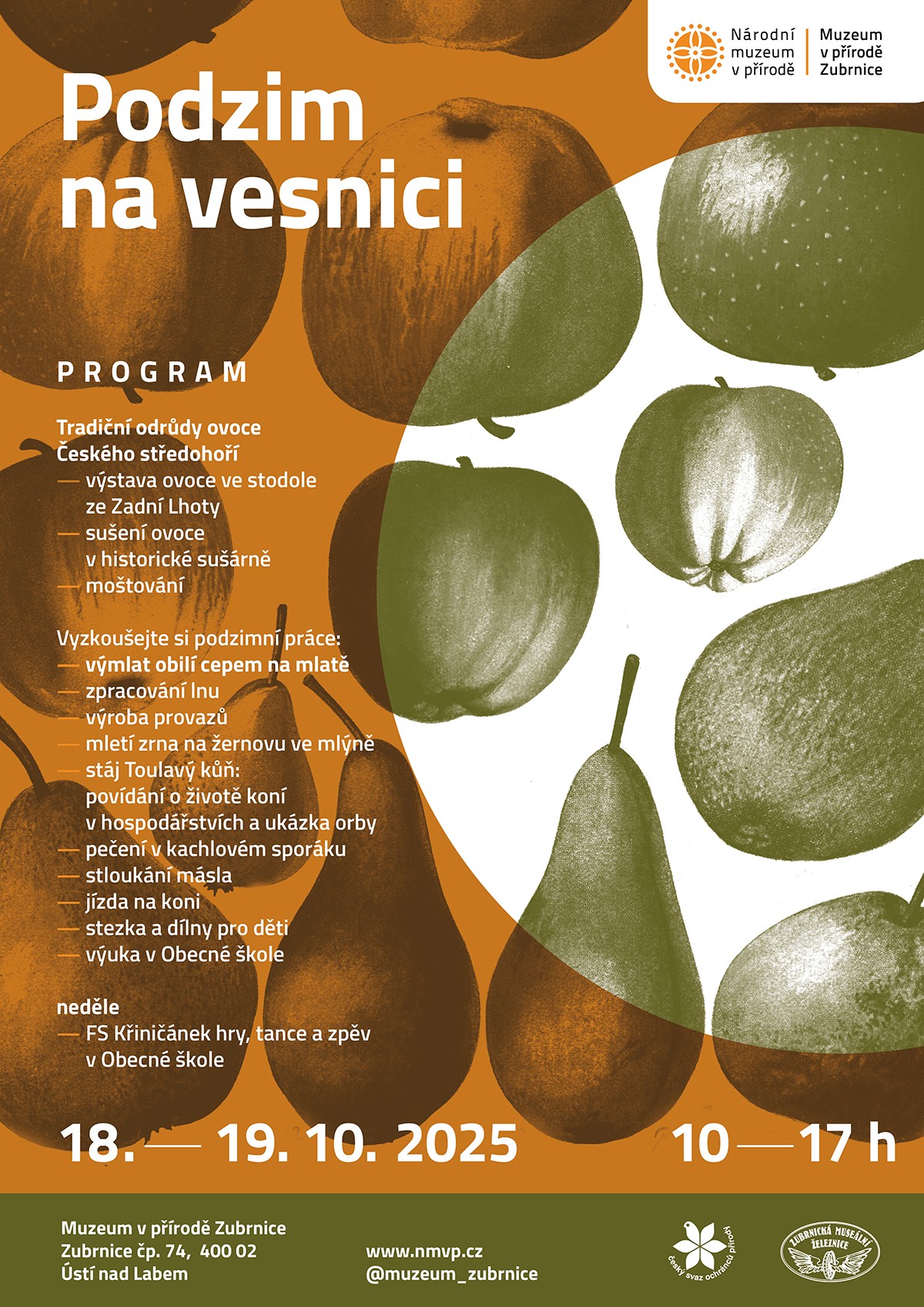 Období sklizně skončilo a my se spolu s vámi pustíme do zpracování úrody - vyzkoušejte si výmlat obilí, zatočte žentourem, vyrobte provaz, zjistěte, k čemu je mědlice, jak se mlelo obilí ve mlýně a sušila jablka. Sušárna nabídne ochutnávku křížal a představí místní tradiční odrůdy ovoce. V obecní škole na vás čeká krasopis. Dvory usedlostí i zubrnická náves ožijí prodejními stánky a ukázkou zemědělské techniky.
