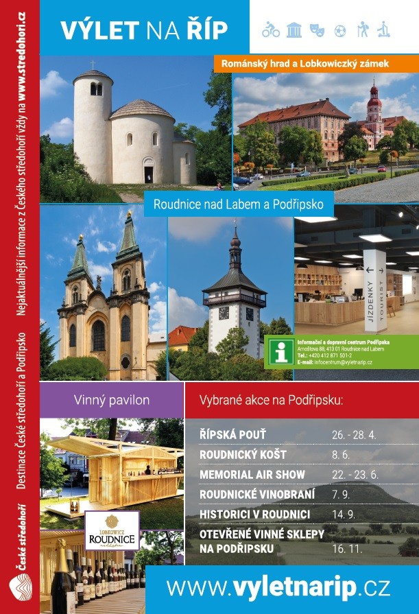 Ve dnech 17. – 20. 1. 2019 se v Brně uskutečnil Regiontour - Mezinárodní veletrh turistických možností v regionech. Čtyřdenní veletrh přilákal mnoho návštěvníků z řad odborníků i široké veřejnosti. Velký zájem byl o informační materiály týkající se cykloturistiky a turistických cílů na trase Labské stezky. Dotazů na možnosti aktivního vyžití ve městech Terezín, Litoměřice, Roudnice nad Labem a okolí padlo nespočet. Návštěvníci se opět velmi zajímali i o památnou horu Říp. Materiály a praktické informace o Českém středohoří a Podřipsku se rozdávaly téměř nepřetržitě. Návštěvníci si odnesli po stovkách kusů propagačních letáků Výlet na Říp: Roudnice nad Labem a Podřipsko a Podřipsko dětem, dále pak cykloturistické mapy Roudnice nad Labem a Podřipsko. K dispozici byla i nová cykloturistická mapa Labské stezky a okolí, turistická mapa Českého středohoří, leták s aktuálními akcemi či leták s nabídkou českých vinařských akcí. V pátek, v sobotu a v neděli proběhla na brněnském veletrhu i krátká vědomostní soutěž s představením destinace České středohoří a Podřipsko. Výhrou byly vždy tři regionální certifikované produkty – víno Fratava z Lobkowiczkého zámeckého vinařství Roudnice nad Labem, pivo Mazel z ústeckého Pivovar Hotelu Na Rychtě a vonný balíček z Levandulové farmy Židovice. V rámci veletrhu byl představen i nový sběratelský 4pohled k Měsíci věží a rozhleden České republiky 28. 9. – 28. 10., na němž jsou vyobrazeny roudnická věž Hláska, Kratochvílova rozhledna, hora Říp a rozhledna Na Horách u Rohatců. V prodeji bude od května 2019 v Informačním a dopravním centru Podřipska.