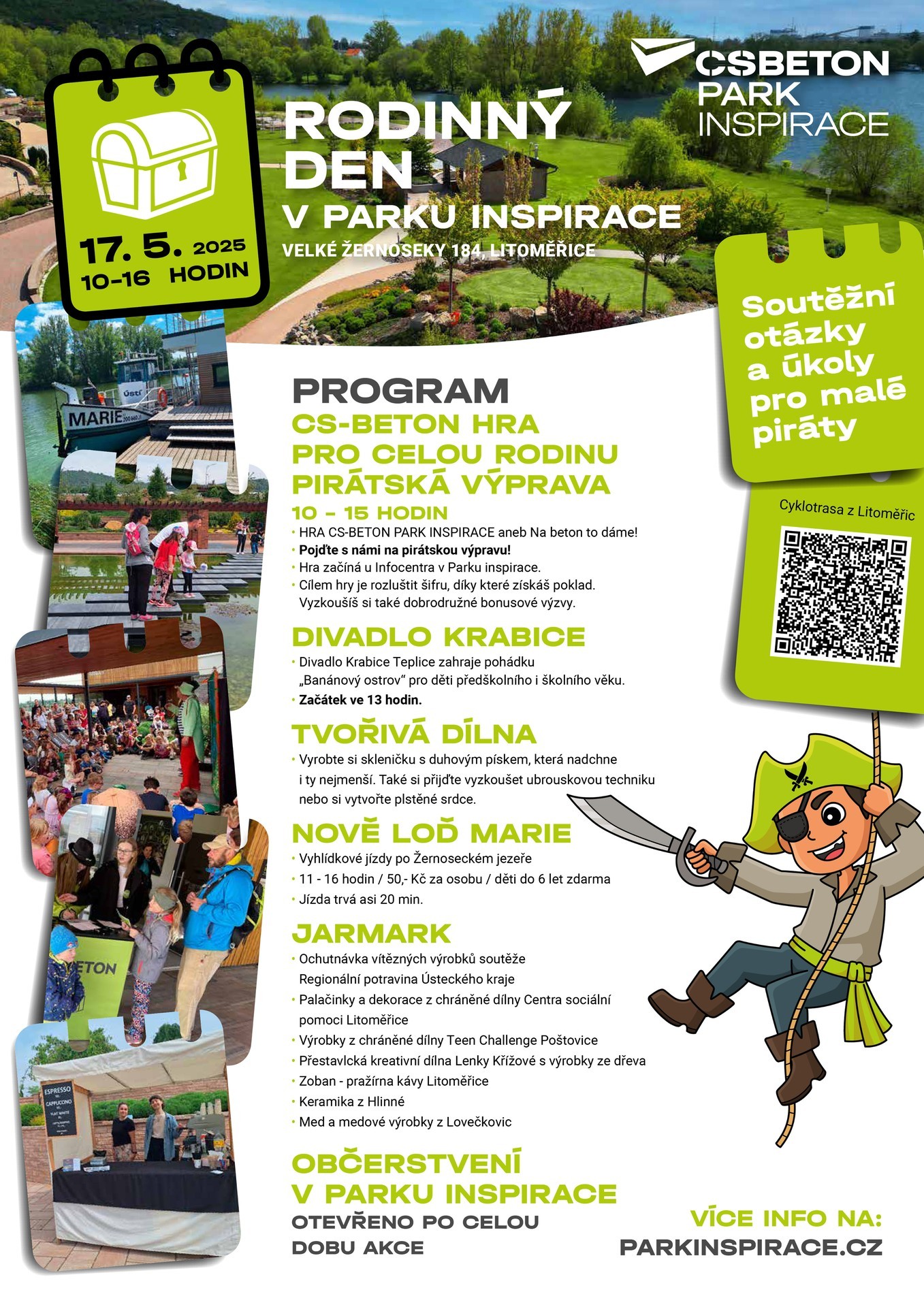 V sobotu 17. května bude Park Inspirace plný aktivní zábavy. Máme pro vás připravenou soutěž na téma Pirátská výprava, divadlo, tvořivou dílnu, jarmark s lokálními výrobci a nově také vyhlídkové plavby lodí na Píšťanském jezeře.