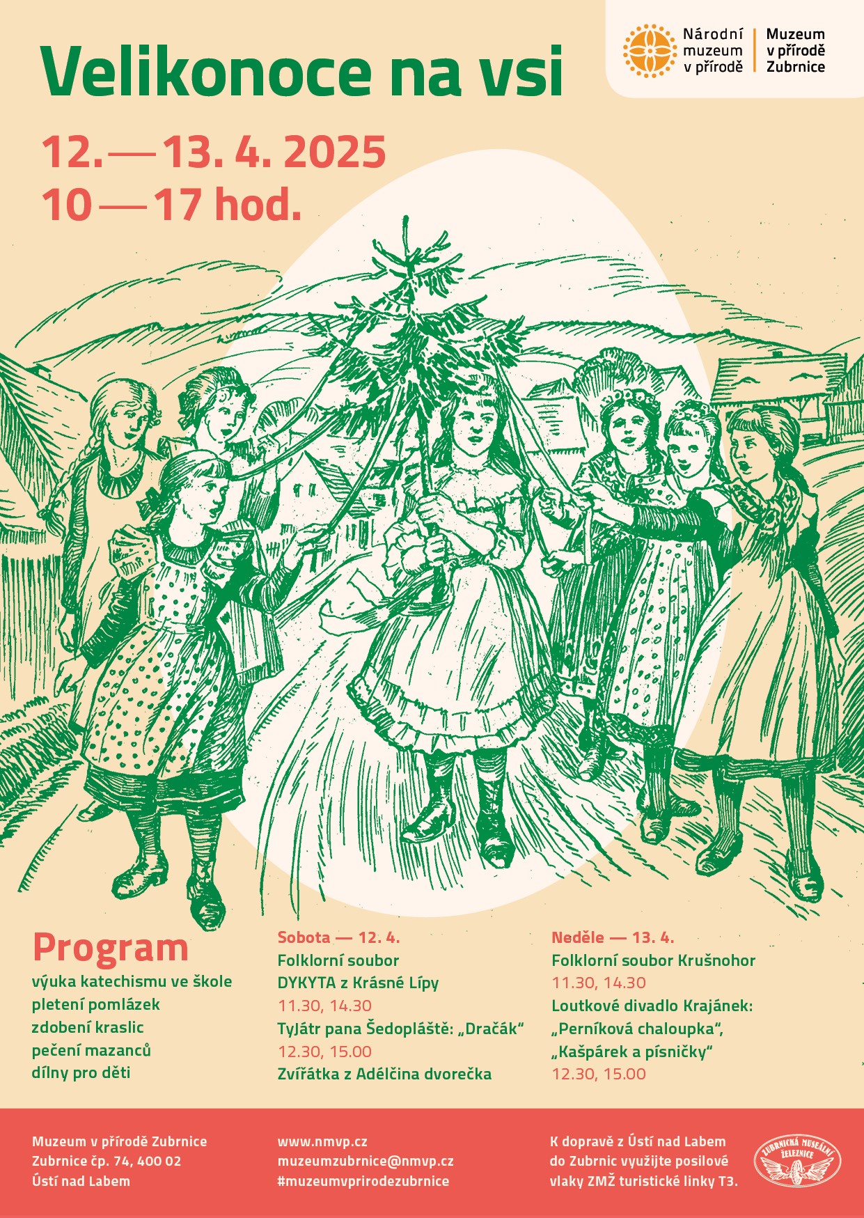 Čerstvě upečený mazanec, vlastnoručně upletená pomlázka nebo ozdobená kraslice. To vše zažijete při oslavách jara a velikonočních zvyků v Zubrnicích. Folklorní soubory potěší písničkou či tancem a na ukázku vynesou Moranu. Na děti čeká divadlo, dílny a hry. Program je doplněn o prodej řemeslných výrobků. To jsou Velinkonoce na vsi v Zubrnicích!