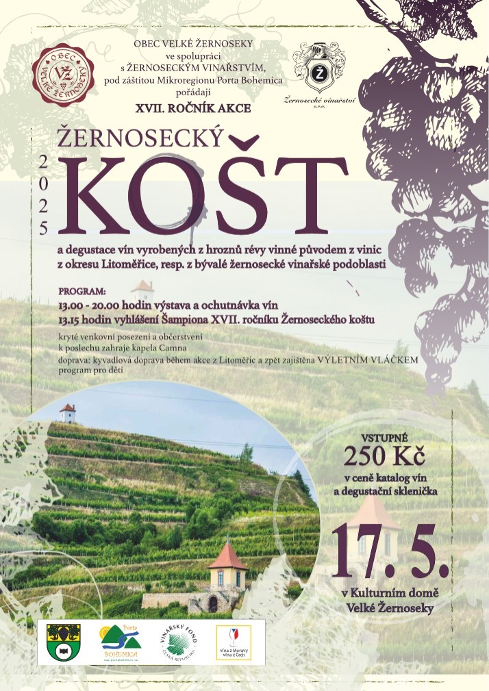 Obec Velké Žernoseky si vás dovoluje pozvat na XVII. ročník vinařského koštu. Akce se uskuteční v místním kulturním domě. Začátek je naplánován ve 13:00.